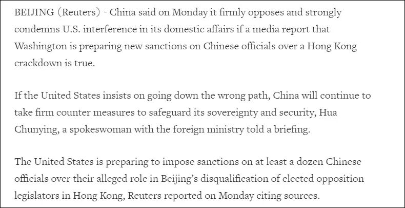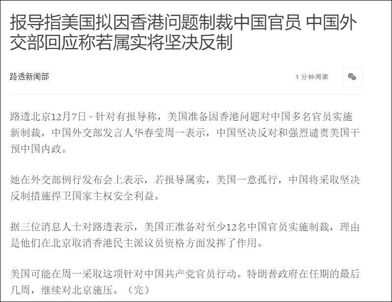 12月7日,外交部发言人华春莹主持例行记者会。有记者提问,有报道称美国政府最快会在当地时间周一宣布对“至少12名、至多14名中国官员实施制裁”,原因是他们“涉及取消多名香港人士议员资格”。中方对此有何评论?