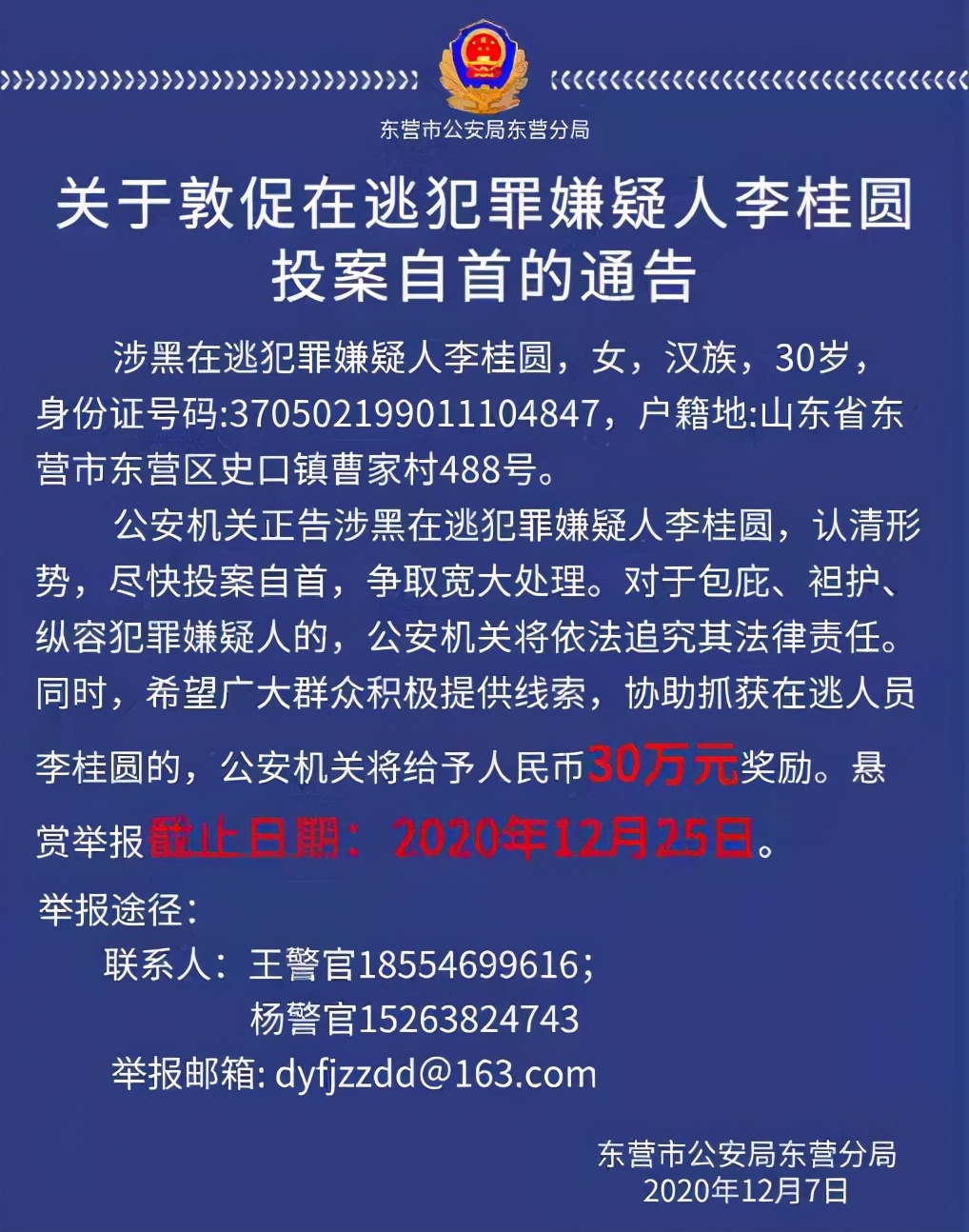 12月7日,中国山东警方发布一则通告,敦促李桂圆投案自首,并且为提供线索的最高奖30万!