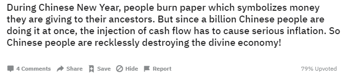 在中国的春节期间,人们都会烧纸钱祭祖,当10亿中国人同时这么做时,大量的现金流必然会引发严重的通货膨胀……