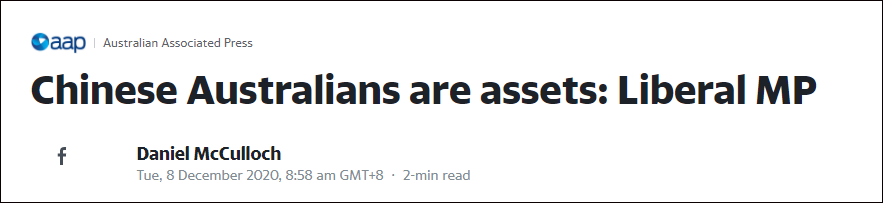 “我们需要视华裔澳大利亚人为可利用的资产。”一手搅乱中澳关系,面对受创的经济却束手无措。黔驴技穷之际,澳大利亚政客居然打起了该国华裔的主意,企图来一场“以华制华”。