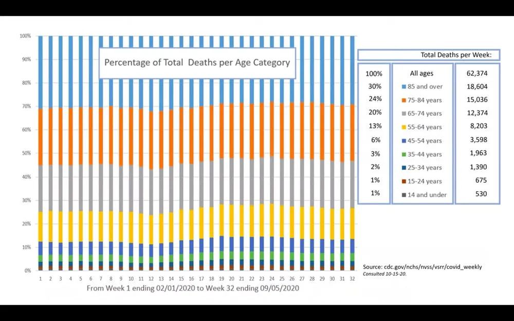 报告的撰写者Genevieve Briand引用的数据均来自美国CDC官方数据,截取的时间段是从今年3月中旬到9月中旬, 这期间美国总死亡人数约170万,其中死于新冠的约20万,占比12%。研究人员发现,虽然新冠死者以耆英居多,但如果对比新冠疫情前与疫情后,耆英死亡率几乎没有变化,甚至各年龄段的死亡率的变化都不明显。