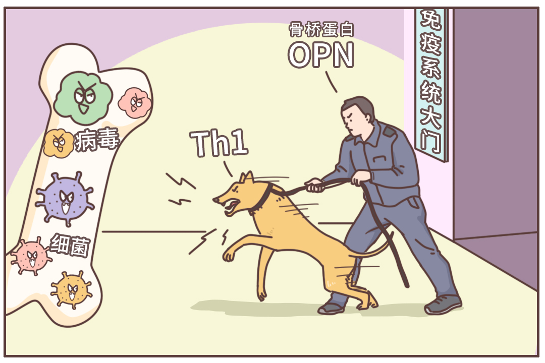 打个比方说,如果病毒和细菌是「骨头」,那么「骨桥蛋白」 就像是开启免疫系统大门的「保安」,Th1 就是看家护院的「猛犬」,当病毒来袭,「骨桥蛋白」就会打开大门放出「猛犬」Th1。