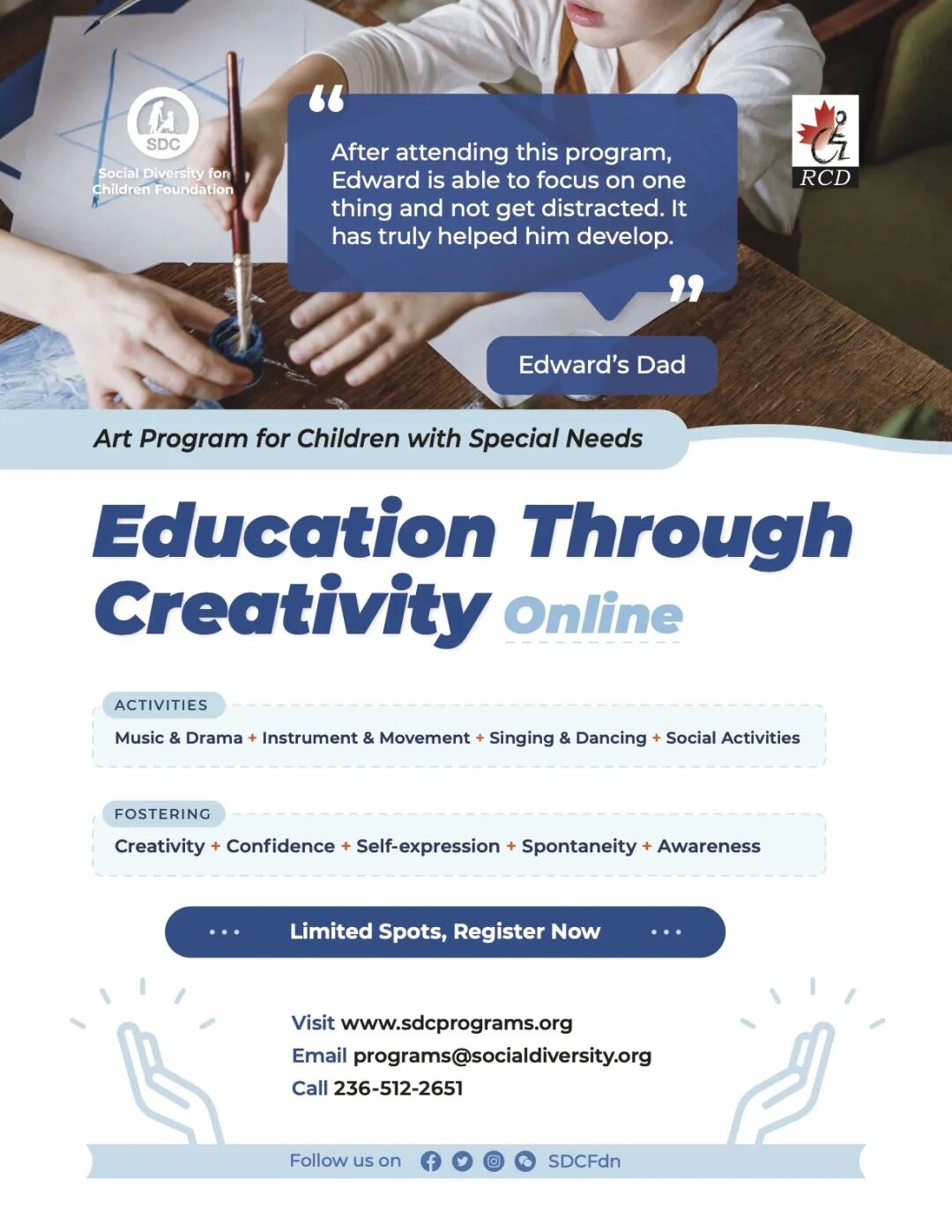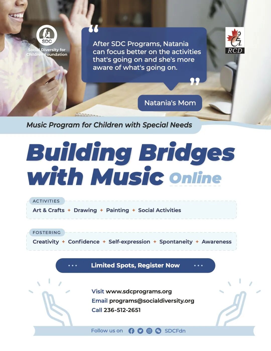 SDC很高兴的宣布2021年度春季的音乐桥(BBM)以及创意美术课(ETC)的线上课程将开始接受孩子们的报名了!明年的课程很荣幸能和列治文残疾中心(RCD)合作举办,为更多需要特殊帮助的孩子们提供能改变孩子未来课程。