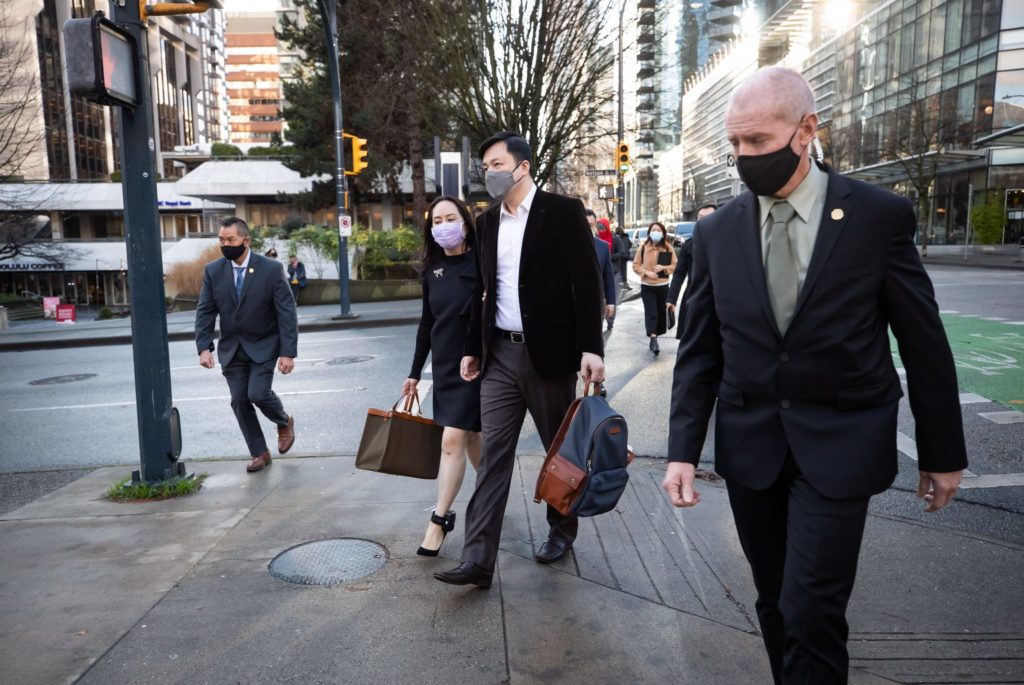 2020年12月9日,星期三,华为首席财务官孟晚舟(中左)在温哥华的听证会休息期后和丈夫一起回到了不列颠哥伦比亚省最高法院。THE CANADIAN PRESS/Darryl Dyck