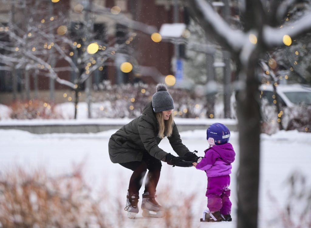 2020年12月9日,星期三,一位母亲在加拿大渥太华的兰斯多恩公园教她的女儿滑冰。THE CANADIAN PRESS/Sean Kilpatrick