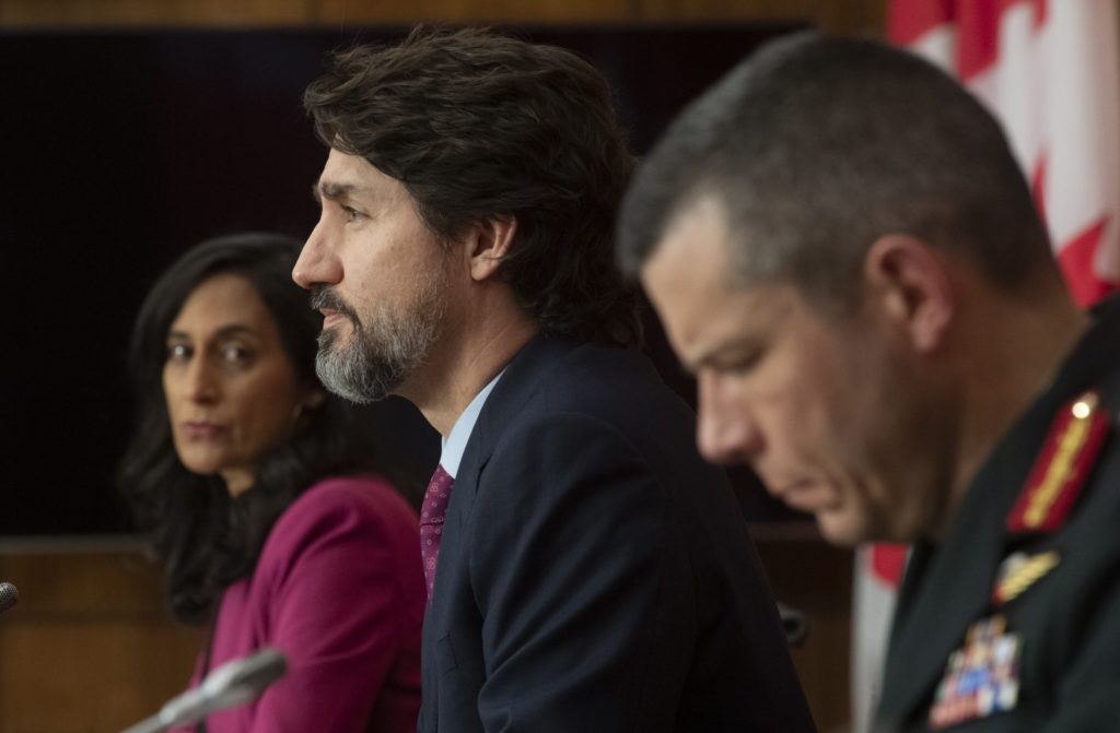 2020年12月7日,周一,加拿大渥太华的一场新闻发布会上,公共服务和采购部长安妮塔·阿南德和加拿大军队少将丹尼·福廷看着总理贾斯廷·特鲁多回答一个记者提问。THE CANADIAN PRESS/Adrian Wyld