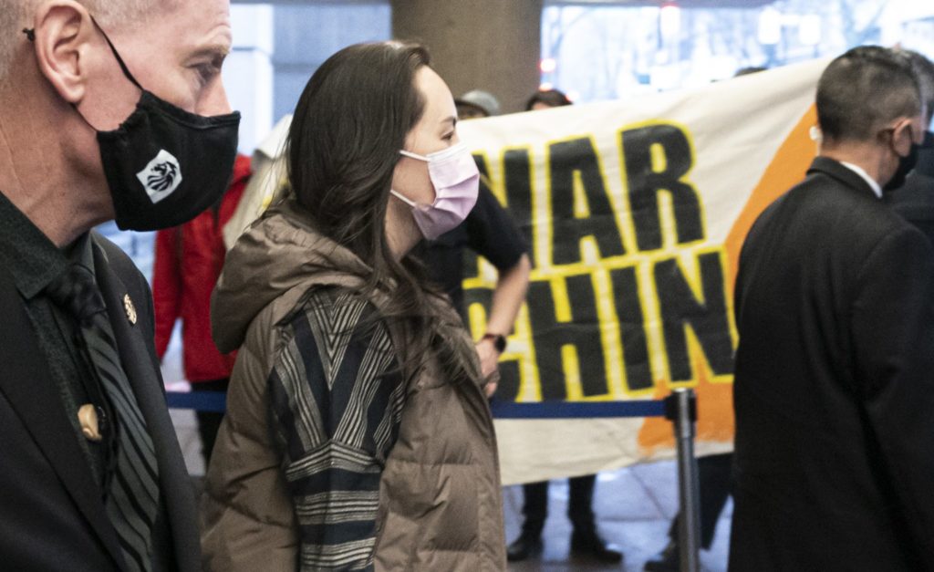 2020年12月7日,周一,加拿大不列颠哥伦比亚省温哥华,华为首席财务官孟晚舟在离开不列颠哥伦比亚省最高法院时走过一群抗议者。THE CANADIAN PRESS/Rich Lam