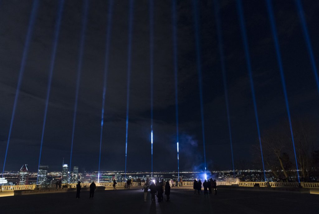 2020年12月6日,星期日,加拿大蒙特利尔,光束投射到空中,以纪念1989年12月6日在反女权主义袭击中被杀害的14名女性。今天是31周年纪念日。THE CANADIAN PRESS/Graham Hughes