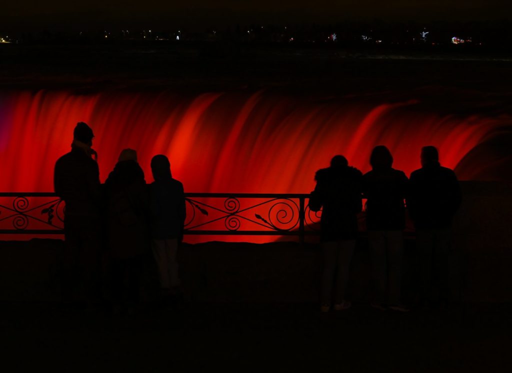 2020年12月6日,星期日,加拿大安大略省尼亚加拉瀑布举行的第38届冬季灯节上,人们俯瞰着灯火通明的瀑布。THE CANADIAN PRESS/Nathan Denette