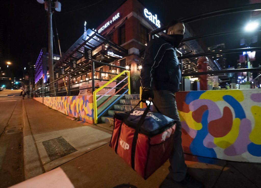 2020年12月3日,星期四,一名送餐员在加拿大温哥华的雅乐镇递送食物时戴着保护性口罩。THE CANADIAN PRESS/Jonathan Hayward