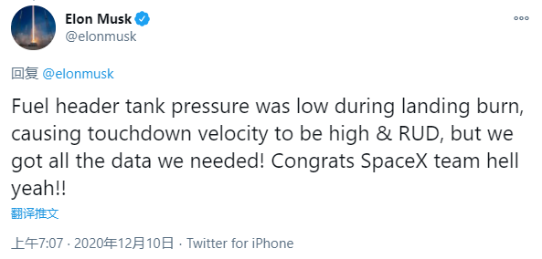 对于这次爆炸,马斯克解释称是因为飞船着陆过程中,头部燃料罐压力较低,因此导致着陆速度较快。