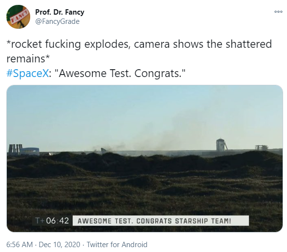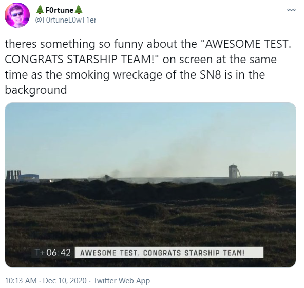 此外,最后在一片残骸的画面下出现的那句“非常棒的测试,祝贺星际飞船团队!”(Awesome Test. Congrats Startship Team!),也引发了网友的调侃……