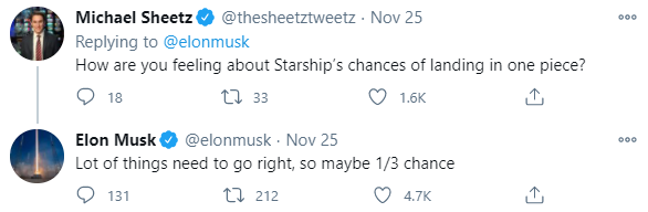 这么看来,纵使SN8最后“尸骨无存”,也算是完成了一定的使命。而且,马斯克此前曾预测过,这次发射和着陆成功的概率只有三分之一。