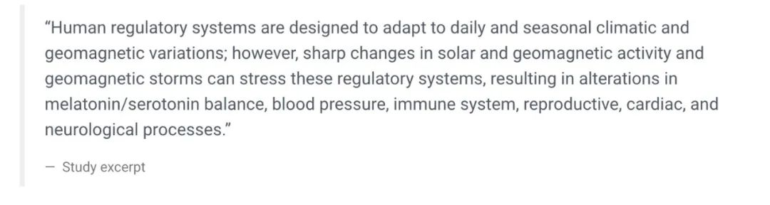 而另一些医学研究发现,地磁风暴的剧烈变动会影响人的植物交感神经、心率、血压、内分泌、免疫系统、情绪及内分泌。