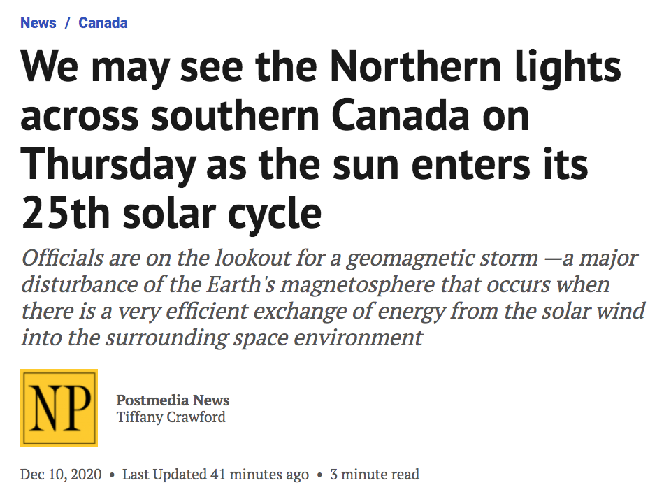 12月9日,美国国家海洋与大气环境总署(NOAA)预测到评级为G3级别的超强太阳风暴将于星期四(10号)抵达地球,引发的剧烈地磁风暴将有可能导致电子设备通讯失灵或断电。唯一的好处在于,半个加拿大地区都可见绚丽极光。不仅加拿大,往南一直到美国爱荷华、宾州、甚至俄勒冈地区都可见极光。