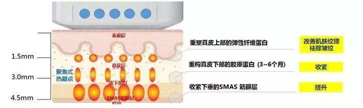Ulthera美版超声刀是光电类产品中唯一一款可以打到筋膜层,从而达到与拉皮相媲美的全脸提升的效果。超声刀的治疗源是超声波,这是它和激光、射频的本质区别,激光、强脉冲光治疗源为光波,射频治疗源为电波。超声刀的加热方式,并不像烤肉那样成片加热,而是作用于皮下产生一个一个的‘热凝固点’,促使胶原蛋白增生和变性收缩。使它们产生更多的胶原蛋白,以弥补流失的胶原蛋白,主要针对改善皮肤纹理、祛除皱纹。而胶原蛋白的变性、收缩,才是达到紧致、提升效果的主要原因。
