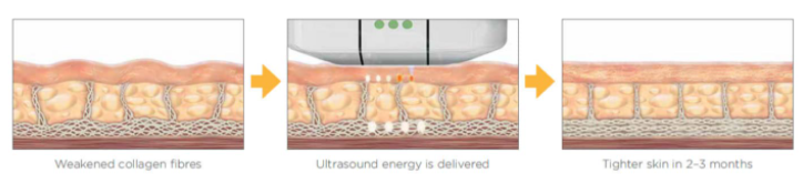 美国正版超声刀利用超声波能量精准的聚交于皮下,温度高达60~70摄氏度,形成规律的小灼伤点,使胶原蛋白收缩重组,刺激新的胶原蛋白再生。