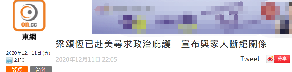报道称,除了宣称与香港的家人断绝一切关系,他还宣称辞去“港独”组织“青年新政”的一切职务。