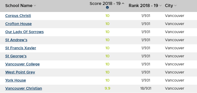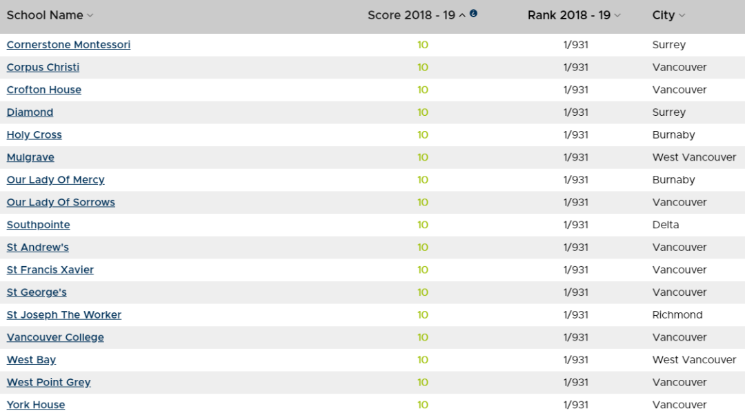 数据显示,在卑诗931所公私立小学中,今年共有17所学校获得10分满分,并列第一,满分学校较去年的19所减少了2所。