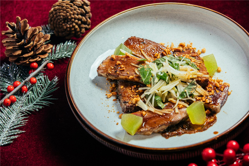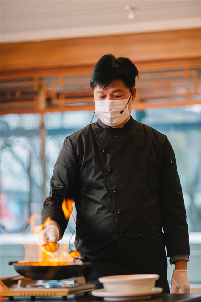 活动现场,福临门主厨许荣华为大家表演了火爆鸡汁寇青边鲍鱼,全新的烹饪方法和火焰象征对着福临门餐厅的热情与祝福,而与之对应的加拿大名厨David Hawksworth则用干冰搭配温烤银鳕鱼进行表演,为线上线下的观众带来一场精彩纷呈的“冰与火之歌”。
