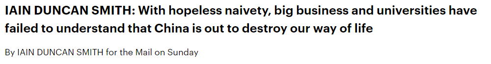 另外英国前保守党领袖伊恩·邓肯·史密斯也是IPAC的负责人。巧合的是,就在英国《每日邮报》刊登有关这个所谓泄密文件的报道之后,这位史密斯先生立马就在《邮报》上发表观点文章,毫无依据地指责中国“正在摧毁英国的生活方式”。