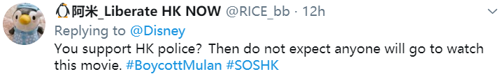 “是啊,木兰如此‘忠’、‘真’以至于她离开祖国投入美籍。带着任人赚钱的‘荣耀’。如此‘勇’去支持港警。谢谢迪士尼毁了木兰。”