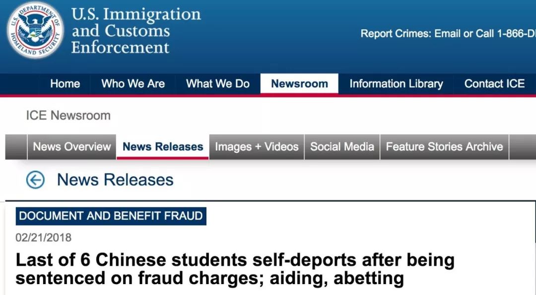 2018年,美国移民及海关执法局通报:涉及2015年一系列考试欺诈案的6名中国留学生在分别被判刑后,已“自愿遣返”回中国。