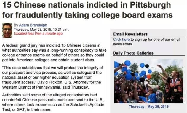 2015年,美国国土安全调查局和美国国务院外交安全处发现,一群中国学生在中国考区雇“枪手”替他们考美国大学高考(SAT)。
