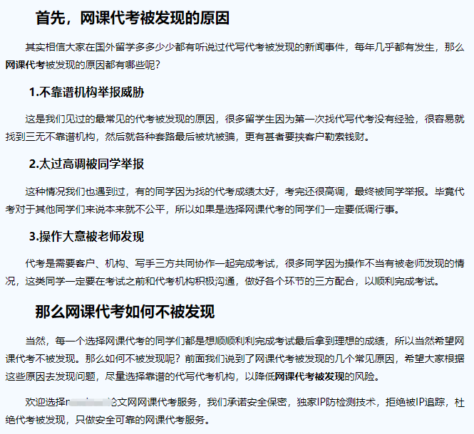 然而看到最后,你会发现这是一篇软文,目的是为了宣传另外一家所谓“安全可靠”的网课代考机构。