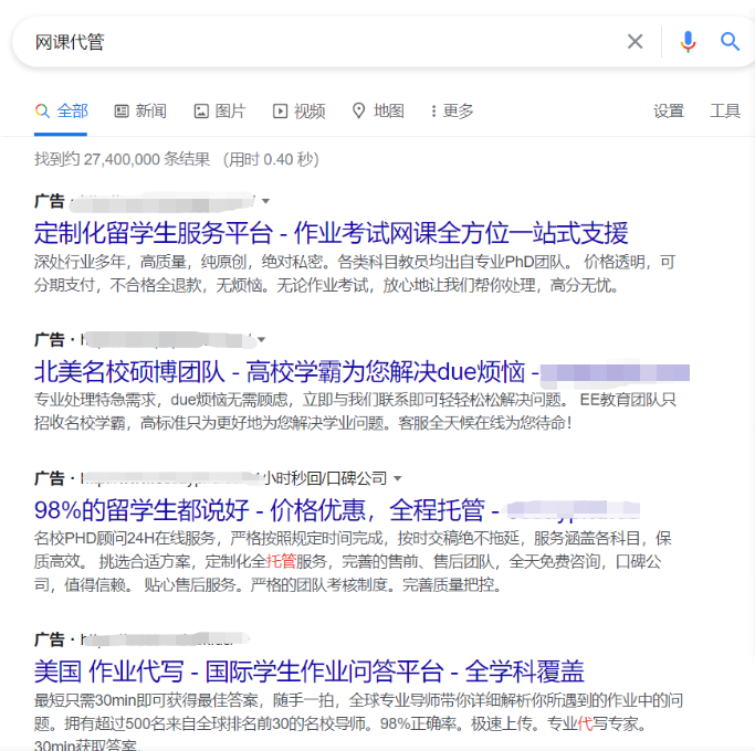 在某搜索引擎搜索“网课代管”四个字,能找到约27,400,000条相关结果。