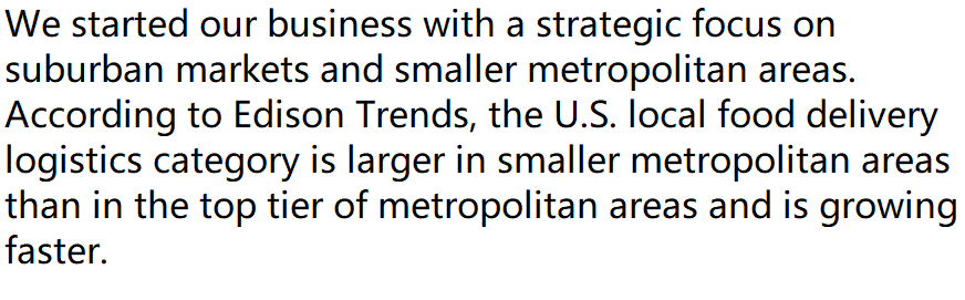 DoorDash 的决策层觉得郊区和农村比城市更需要外卖,而且郊区一般都是一大家子,外卖一点就是一大份,对手们也都不怎么关注郊区,明显做郊区的生意更好做。