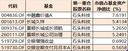 从基金三季报第一大重仓股看,有6只基金第一大重仓股为石头科技,其中中融鑫价值A、长城久祥、景顺长城成长领航、景顺长城公司治理4只基金第一重仓股市值占基金资产净值比超过了5%。
