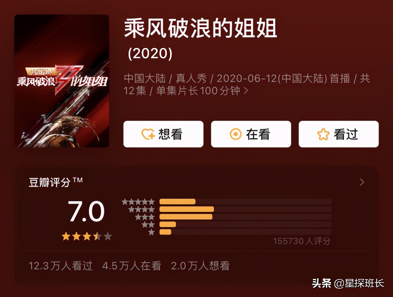 众所周知,《浪姐》第一季虽然获得了巨大的成功,但在口碑方面却是明显的高开低走,前期口碑爆棚,后期却接连下跌,最终的豆瓣评分也只有7.0分!