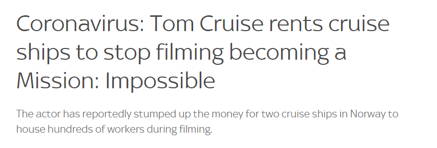 此前,汤姆·克鲁斯甚至自掏腰包,花了50万英镑租邮轮供剧组成员居住,以保持隔离状态,使拍摄顺利进行。