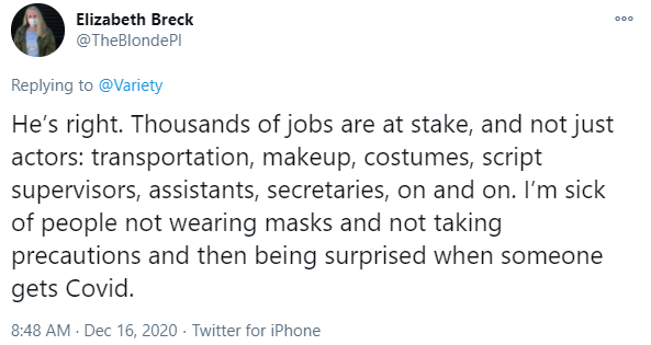 他是对的,不仅仅是演员,交通、化妆、服装、剧本、助理、秘书等等很多工作都会受到影响,我讨厌人们不戴口罩,不采取预防措施,然后当有人感染时又感到惊讶。