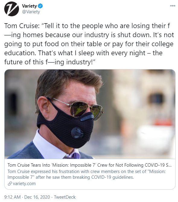 《太阳报》最早曝出了这段录音,《综艺》等媒体证实此事确有发生。阿汤哥称,《碟中谍7》之所以能够继续拍摄,完全因为剧组执行防疫标准: