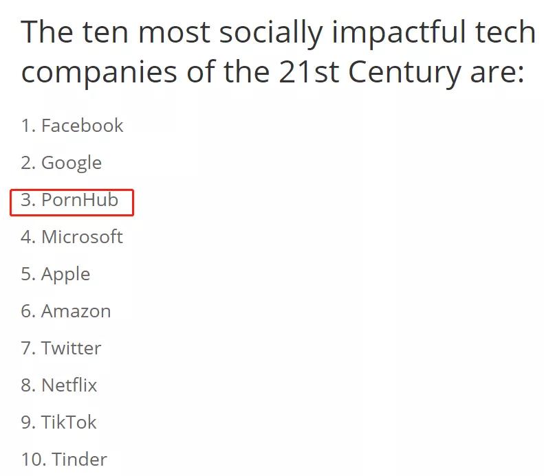 讽刺的是,与此同时 Pornhub 又因为优秀的营销和科技方面投入,被媒体评为 21 世纪社会影响最大的技术公司之一。