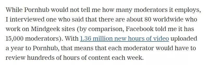 因为他通过线人得知, Pornhub 隶属于 Mindgeek 集团,而 Mindgeek 总公司旗下的所有网站,只有 80 个审查员,相比之下 Facebook 都有 15000 个审查员。
