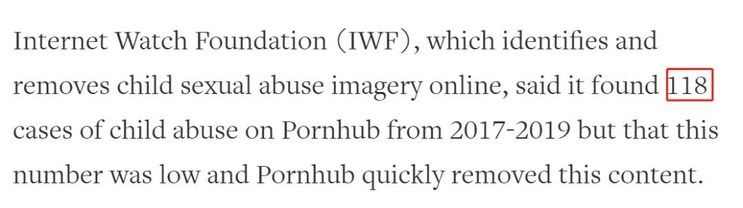作为色情网站的 Pornhub 则没有公开相关的数据,唯一能查到的,就是 P 站在互联网观察基金会上报了 118 个儿童性虐待案例。。。