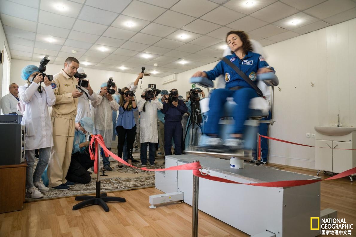 2019年9月18日,哈萨克斯坦拜科努尔的宇航员宾馆,美国宇航局宇航员 Jessica Meir坐在旋转椅子上测试她的前庭系统。一周后,她乘坐俄罗斯联盟号飞船前往国际空间站。 摄影:NASA
