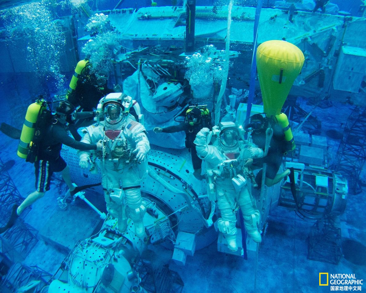 美国宇航局宇航员Scott Tingle(右)是入选阿尔忒弥斯计划的宇航员之一。图中,他和同事Steve Swanson正在美国宇航局约翰逊航天中心(位于德克萨斯州休斯顿)附近的中性浮力实验室接受太空行走训练。摄影:NASA