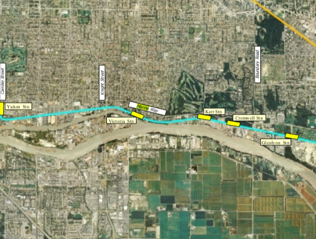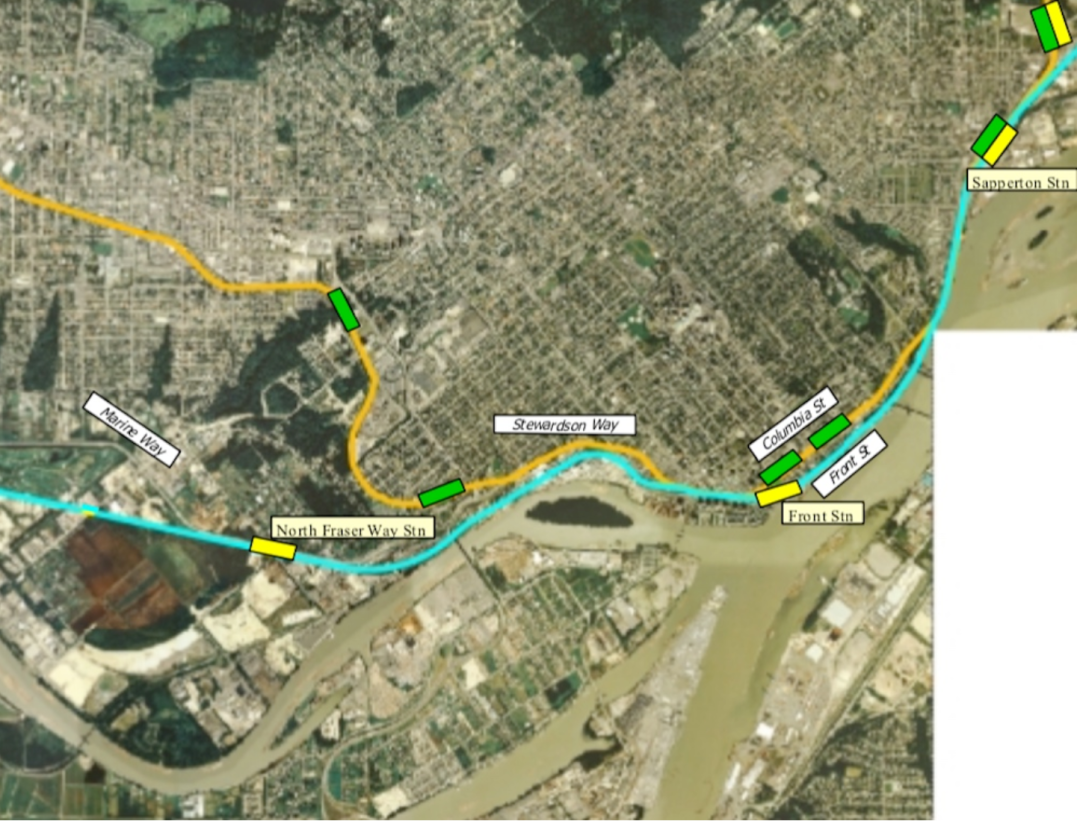 自西向东,这条双向轻轨铁路从现有加拿大线的Marine Drive天车站出发,一路沿着菲沙河北岸穿过温哥华、本拿比和新西敏,并最终直达高贵林市中心。