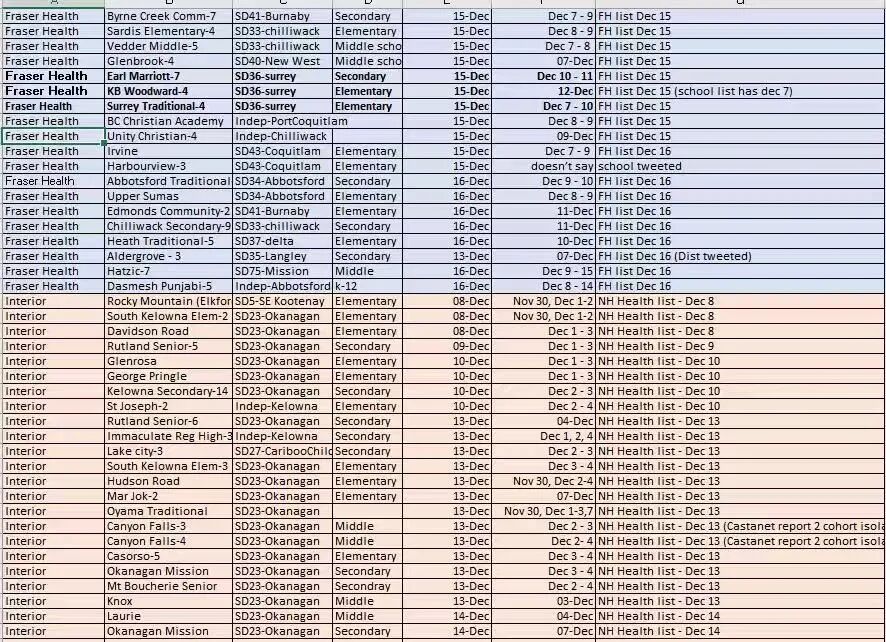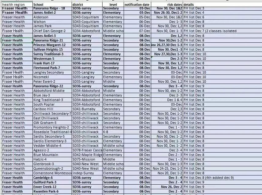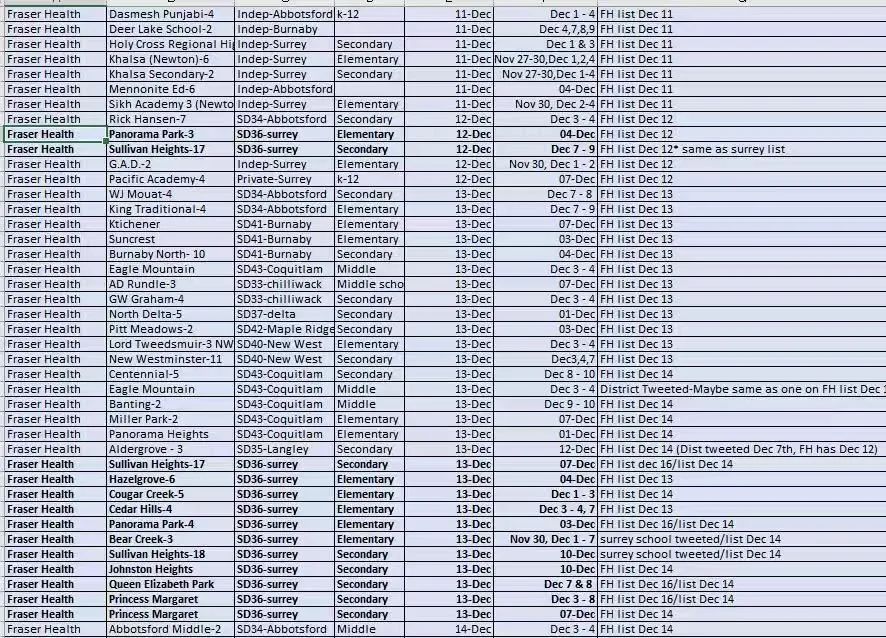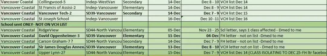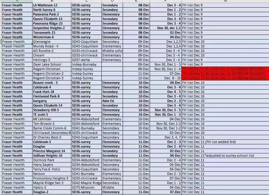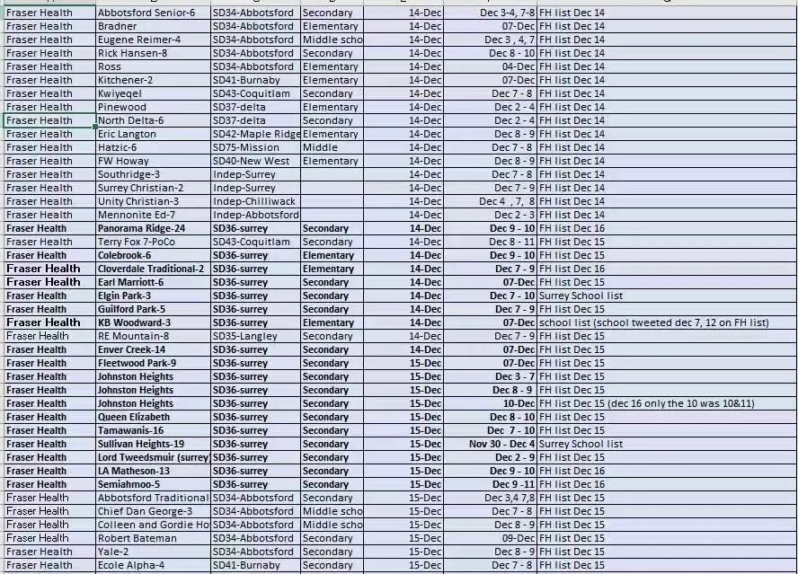 根据大温多家卫生局12月16日的最新学校感染数据,发现潜在暴露事件的学校已经有这么多了: