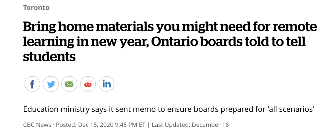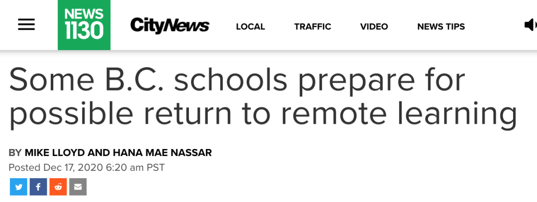 对于很多BC省学生来说,这周是2020年圣诞前的最后一个星期了。但是对于在疫情中摸爬滚打了一年的学生和家长来说,这个圣诞却让人少了一些期待,因为根据17号News1130的报道来看,圣诞假期过去之后,部分BC省学区如新西敏和兰里,已经做好了重新返家上网课的准备。