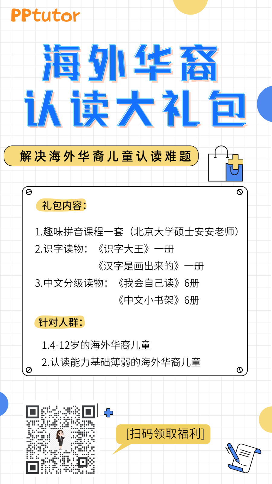为了帮助海外华裔儿童更好的识字,PPtutor特意准备了适合4-9岁儿童的识字大礼包,助力孩子的中文学习。礼包包含: