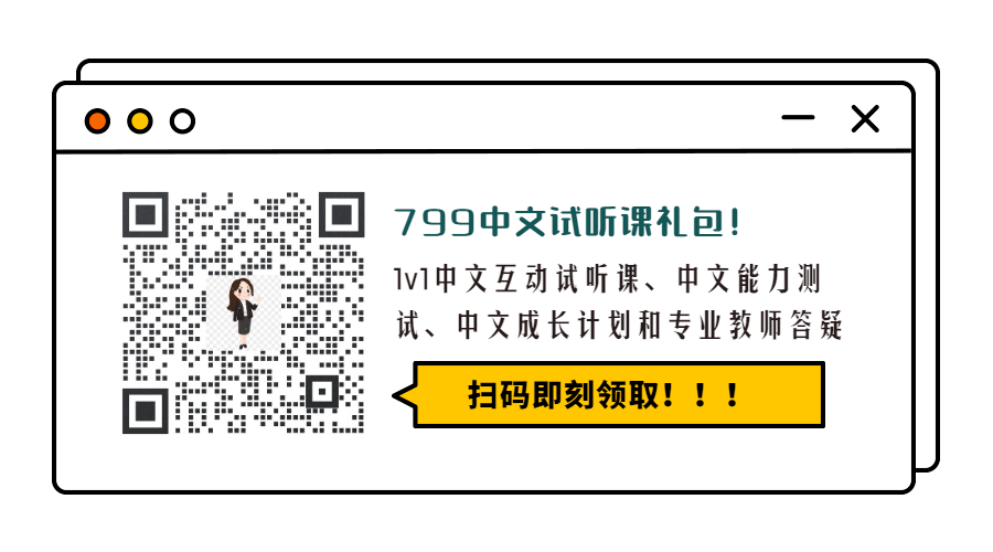 现在扫描文中二维码添加课程顾问,立即获得价值799的中文试听课礼包(包含:1节1对1名师在线中文课,1次中文能力测试,1份中文成长计划,1位专业教师答疑。还有福利礼包:5节《传统文化故事》直播课,40节《趣味识字》视频课,160节《巧学成语》视频课。)