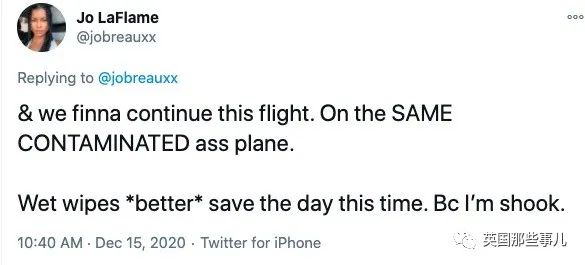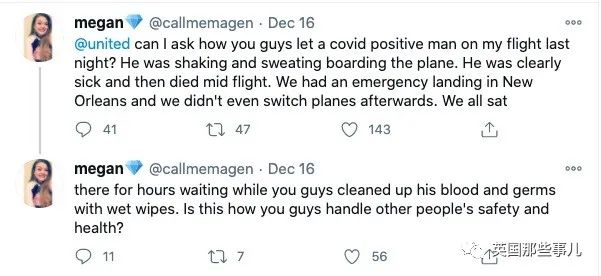 “美联航,我想问你,你怎么会让一个新冠阳性的病人上飞机?他登机的时候就开始颤抖流汗了。他明显就病了,然后在飞机飞行途中死亡了。我们在新奥尔良紧急降落,甚至之后都没有换飞机。我们就坐在那里等几个小时,等你们把病人的血和细菌用湿纸巾擦掉。这就是你们照顾我们健康和安全的方式吗?”