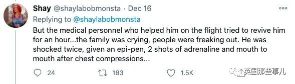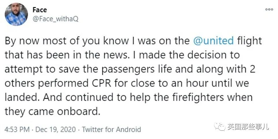 “那些医疗人员在飞机上对他抢救了1个小时… 他家人在哭,其他乘客吓坏了。他被电击了两次,打了两剂肾上腺素,胸外按压…”