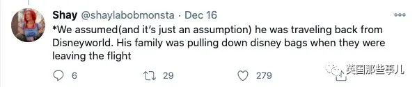 她猜测,当时这家人是从迪士尼乐园游玩结束,准备回家,因为当他们离开飞机时,他家人拿下了一些迪士尼的袋子。