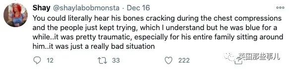 “在对他做胸外按压时,你可以听到骨头断裂的声音,但他们还在不停尝试。我虽然理解,但他身体那时已经发青一会了…